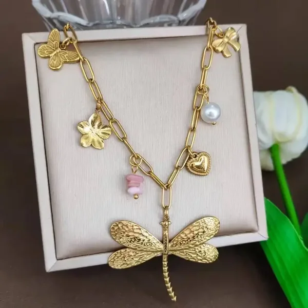 Ce collier en acier inoxydable doré présente une chaîne à maillons ornée de charms délicats : papillon, fleur, libellule, cœur, perle et nœud. Léger, durable et lumineux, il apporte une touche féminine et fantaisie à chaque tenue. Son style élégant et joyeux en fait un accessoire polyvalent, parfait pour sublimer un look quotidien ou plus habillé. En Acier Inoxydable, Sans Nickel, sans Cadmium et sans Sel de Plomb